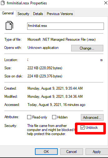 - resx 파일을 마우스 오른쪽 버튼으로 클릭하고 속성을 열고 '차단 해제' 옵션을 선택 후 '확인'